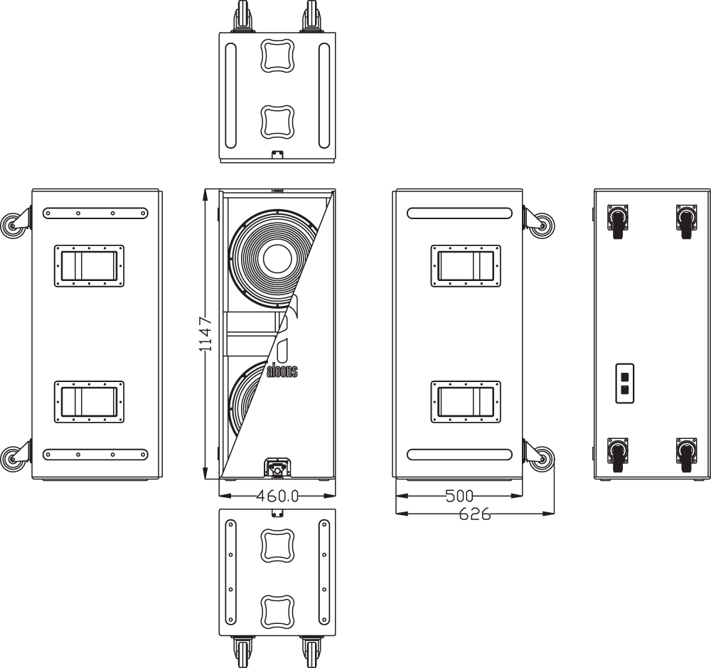 The SIS pre-wiring ensures complete cable/connector compensation between the BF302 and ALC. Typical applications for the BF302 include bass extension of main sound systems, used in multiples depending on the application and low frequency requirements. The higher tuning makes the BF302 an ideal high-power punch-bass system for live- or club sound, in combination with an Alcons top cabinet / array. For full system performance, we recommend using the BF302 in combination with an ALC4 (or ALC6) amplified loudspeaker controller. Driven by the ALC, the BF302 delivers maximum sound quality and output power with dedicated and inaudible (power and excursion) protection (SDP circuit). The BF302 is available in standard version, or installation version. The BF302i (“install”) comes without handles, castor wheels and cover. |